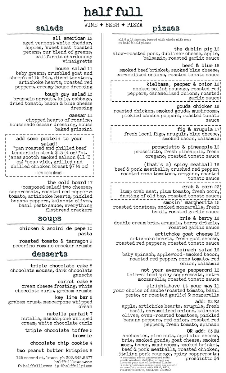 Introducing Half Full, a delightful pizza haven located at 125 2nd St, Lewes, DE. This cozy spot boasts an inviting atmosphere, perfect for those seeking a casual dining experience. Guests rave about the exceptional pizzas, such as the "Not Your Average Pepperoni Pizza" and inventive options like the Cuban Pizza and Braised Lamb Pizza. The quality ingredients and artistic combinations elevate traditional flavors, ensuring a memorable meal every time you visit.